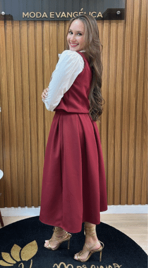 Conjunto em alfaiataria premium com acabamento sofisticado. Colete regata forrado. Acompanha botões encapados com bordas douradas funcionais. Com camisa no tecido cedinha com botões funcionais. Faixa para amarração opcional. Saia no modelo godê, midi com zíper.
