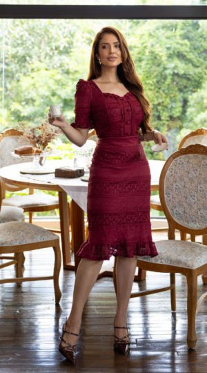 VESTIDO NO MODELO TUBINHO NA RENDA DE ALGODÃO TRABALHADA COM BABADOS. POSSUI DECOTE CORAÇÃO E APLICAÇÃO DE BOTÕES ENCAPADOS NÃO FUNCIONAIS E RENDA GUIPIR VERTICAL NO BUSTO. POSSUI MANGA ¾ LEVEMENTE BUFANTE COM APLICAÇÃO DE RENDA NO PUNHO FORMANDO BABADO. SAIA NO MODELO TUBINHO COM APLICAÇÃO DE BABADO NO BARRADO. POSSUI ZÍPER NAS COSTAS. POSSUI FORRO.