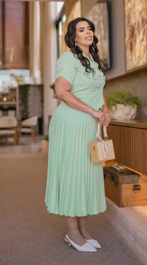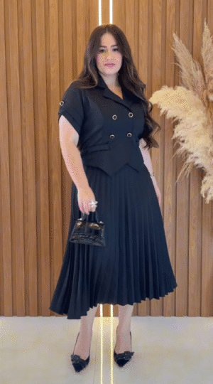 Conjunto Serena confeccionado na alfaiataria premium. Saia max midi plissada, com lastex na parte de trás. Colete possui botões funcionais.
