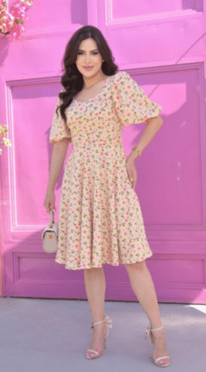 Vestido lady like na sedinha estampada. Possui decote coração com aplicação de pregas Thomas horizontais na cintura. Possui manga balonê no mesmo tecido da peça com aplicação de elástico no punho. Saia no modelo godê. Possui zíper nas costas. Possui forro.