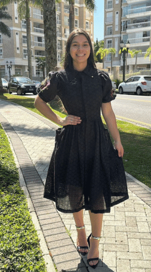 Vestido na cambraia de algodão trabalhada no modelo chemise. Possui gola boneca e aplicação de botões funcionais em toda a frente do vestido. Possui manga bufante com detalhe de bordado maquinetado e elástico no punho. Saia no modelo godê com aplicação de bolsos laterais funcionais. Possui forro à parte.
