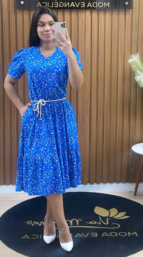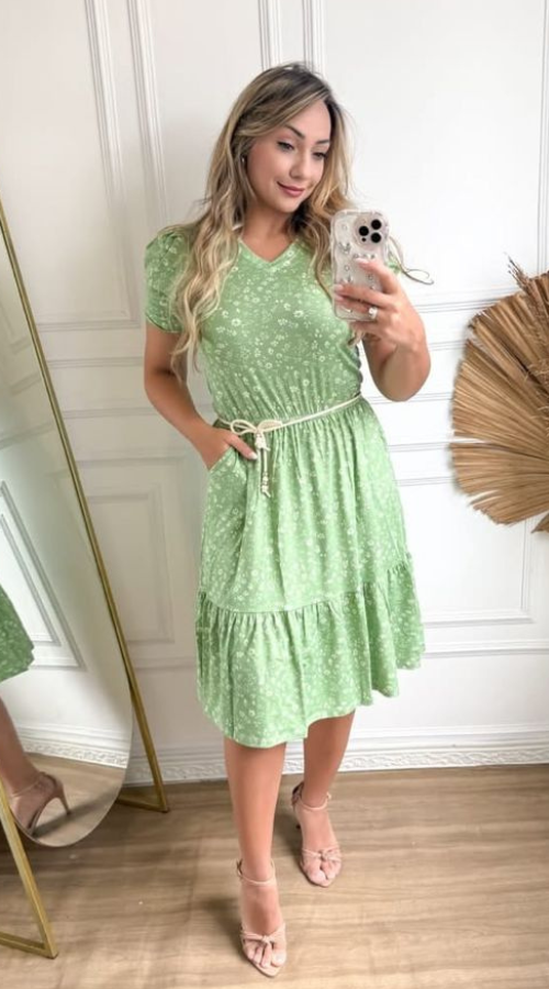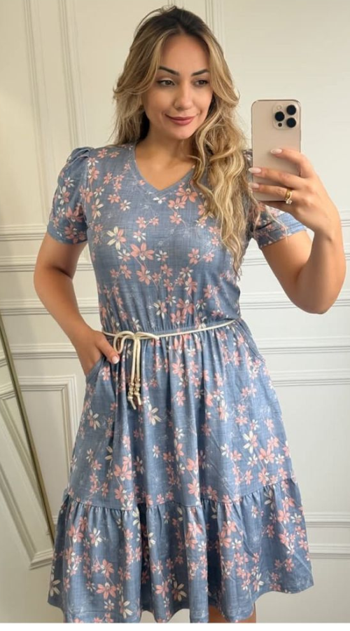 Vestido no tecido de Viscolaycra. Possui bolsos, faixa para amarração na cintura e possui forro na parte da saia.