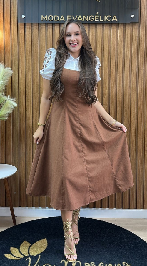 Vestido modelo Salopete, mangas no tecido de tricoline e vestido no tecido de Linho de Algodão. Possui aplicação de botões funcionais na gola. Possui manga princesa com detalhe em bordado. Saia no modelo godê. Possui ziper. Possui forro.