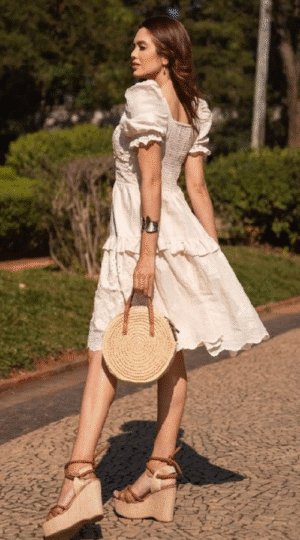 Vestido lese com flores em relevo 3D e decote quadrado com babadinhos.
