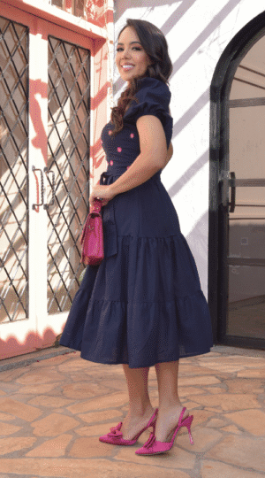 Vestido no modelo Lady Like no tecido de cambraia lisa. Possui decote quadrado com detalhes de bordado maquinetado e manga princesa com elástico no punho. Possui lastex nas costas e acompanha faixa para amarração. Saia no modelo evasê com 2 Marias e possui forro.